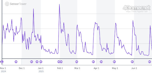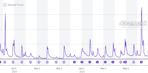 Top25のタイトルで最も収益の成長率が高いのは「鳴潮」だ。6月12日に新星5共鳴者「カルテジア」を実装し,その際の収益が「吟霖」の実装時(2024年6月)に記録した収益を超え,最大収益を更新した。