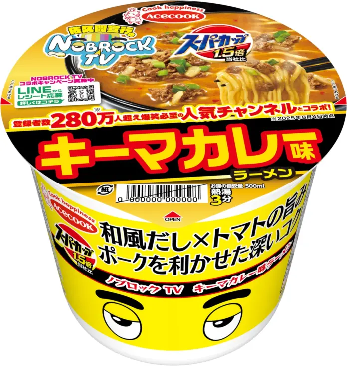 エースコック株式会社は、人気YouTubeチャンネル「NOBROCK TV」と初のコラボレーションとして、『スーパーカップ1.5倍×NOBROCK TV キーマカレー味ラーメン』を11月3日から発売します。この製品は、280万人以上の登録者を持つ「NOBROCK TV」のカレーラーメン企画を基にしており、風味豊かな魚介醤油スープとスパイスを使った肉そぼろを特徴にしています。