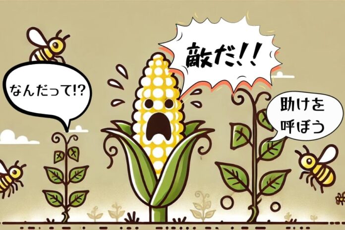 トウモロコシは害虫に襲われると、揮発性物質を放出して助けを求めます。この物質は寄生バチを引き寄せ、害虫を駆除する役割を果たしています。 -