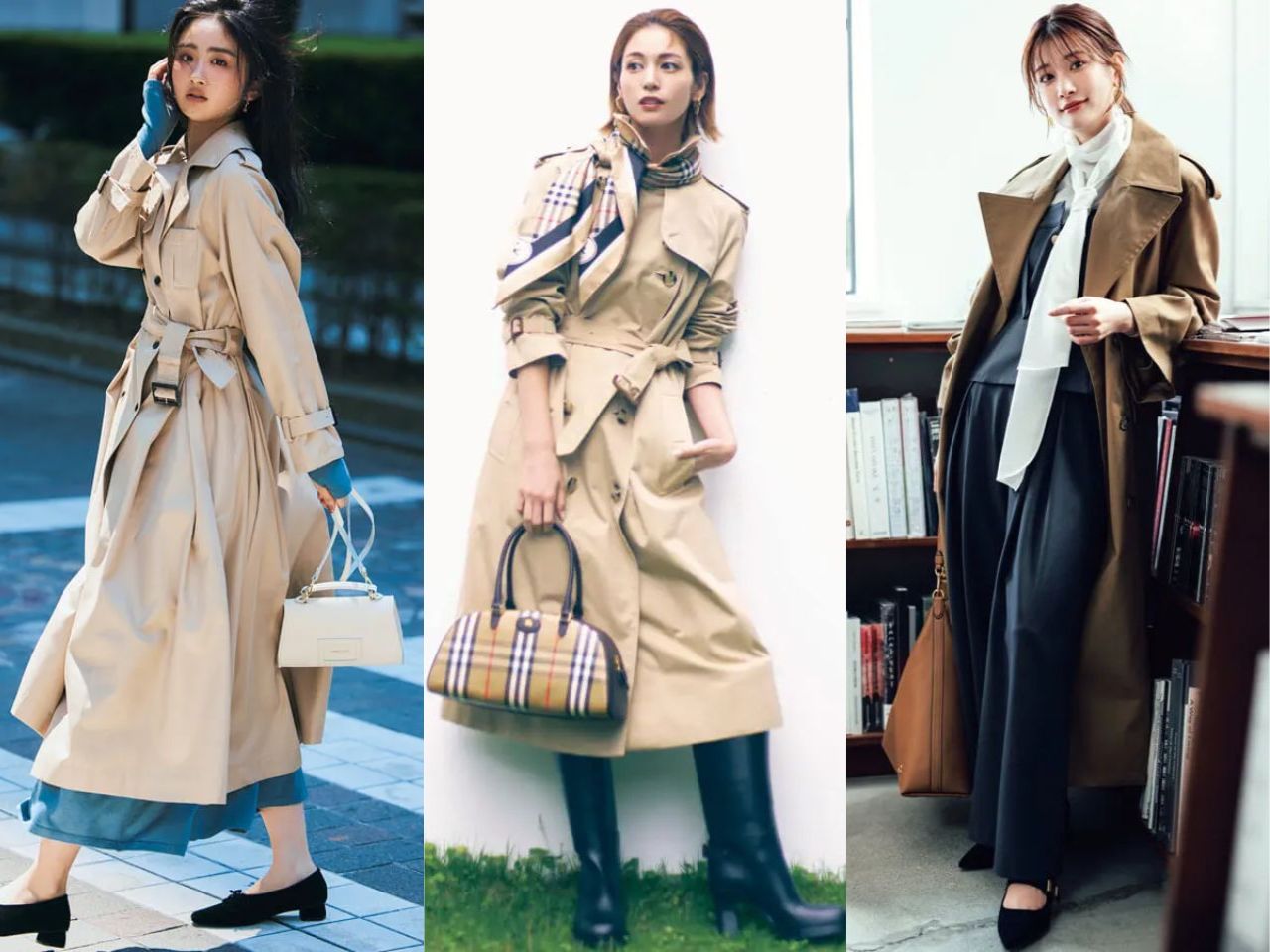 - 春:トレンチコートの下にシアートップスやボウタイブラウスを組み合わせ、大人っぽい印象に。