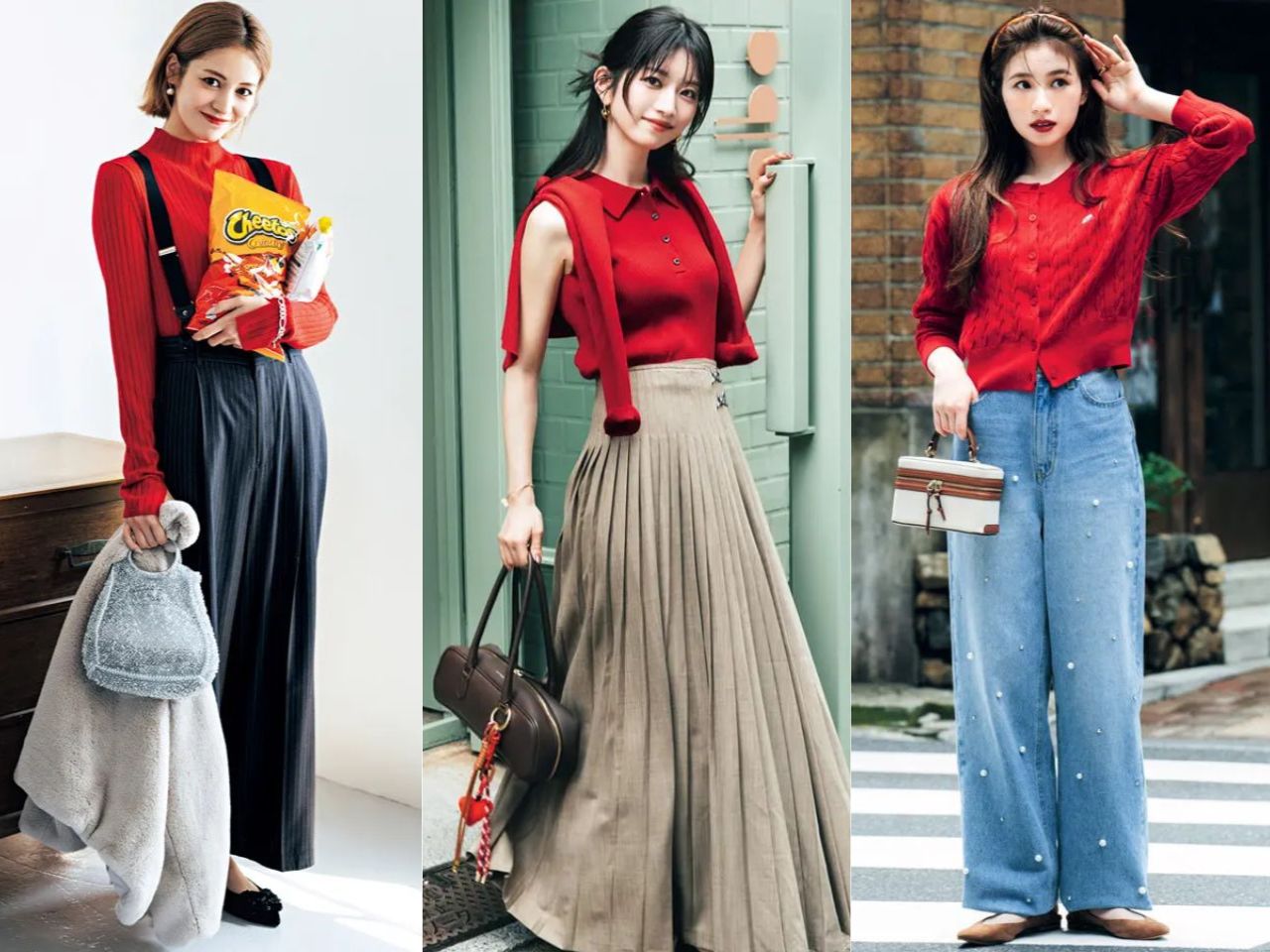 この内容では、今季のトレンドカラー「赤」を用いたコーディネートやその組み合わせ方が中心に紹介されています。特に、赤アイテムを取り入れることで華やかさを加えたり、他の色(黒、ネイビー、ブラウンなど)とのバランスを考えた着こなし提案がされています。