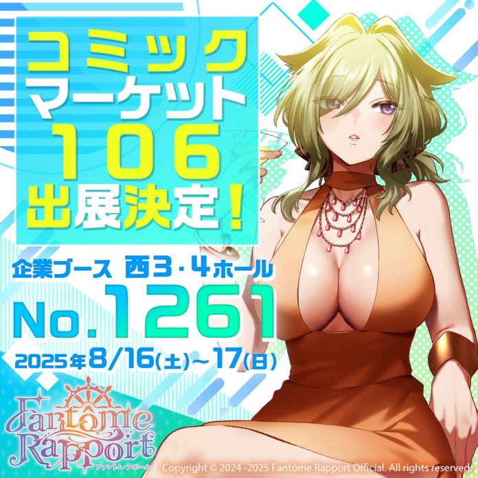 エヌ・ティ・ティ・ソルマーレ株式会社は、恋愛×ホラー×ミステリアスアドベンチャー「Fantôme Rapport」を、2025年8月16日(土)〜17日(日)に東京ビッグサイトで開催される「コミックマーケット106」に出展することを発表しました。コミックマーケット106は、東京国際展示場で行われ、主催はコミックマーケット準備会です。