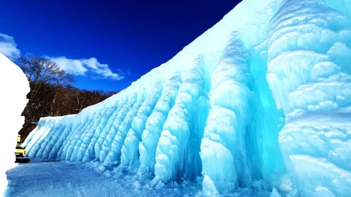 支笏湖の水を使用しているため、氷は白く濁らず、光を透過します。昼は自然光で青く、夜はライトアップによってより深い青を体験できるのが特徴です。 -
