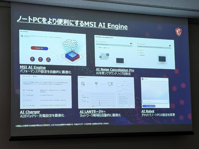 「AIを駆使せよ」をテーマに、製品に搭載されている「MSI AI Engine」ではパフォーマンスの最適化をはじめ、サウンドノイズの除去や電力設定、ネットワークの帯域の最適化などをAIを活用しつつ行えるほか、チャット形式で設定を変更できるような機能も用意されています。
