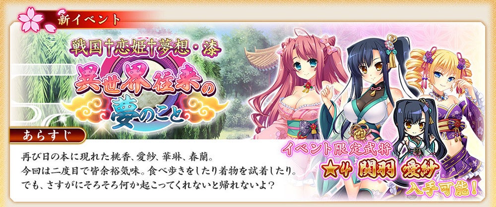 合同会社EXNOA(本社:東京都港区、CEO:村中 悠介、URL:https://games.dmm.com/)が運営するDMM GAMESは、配信中のオンラインゲーム『戦国†恋姫オンライン ~奥宴新史~』において、『恋姫†夢想』コラボの開催をお知らせいたします。