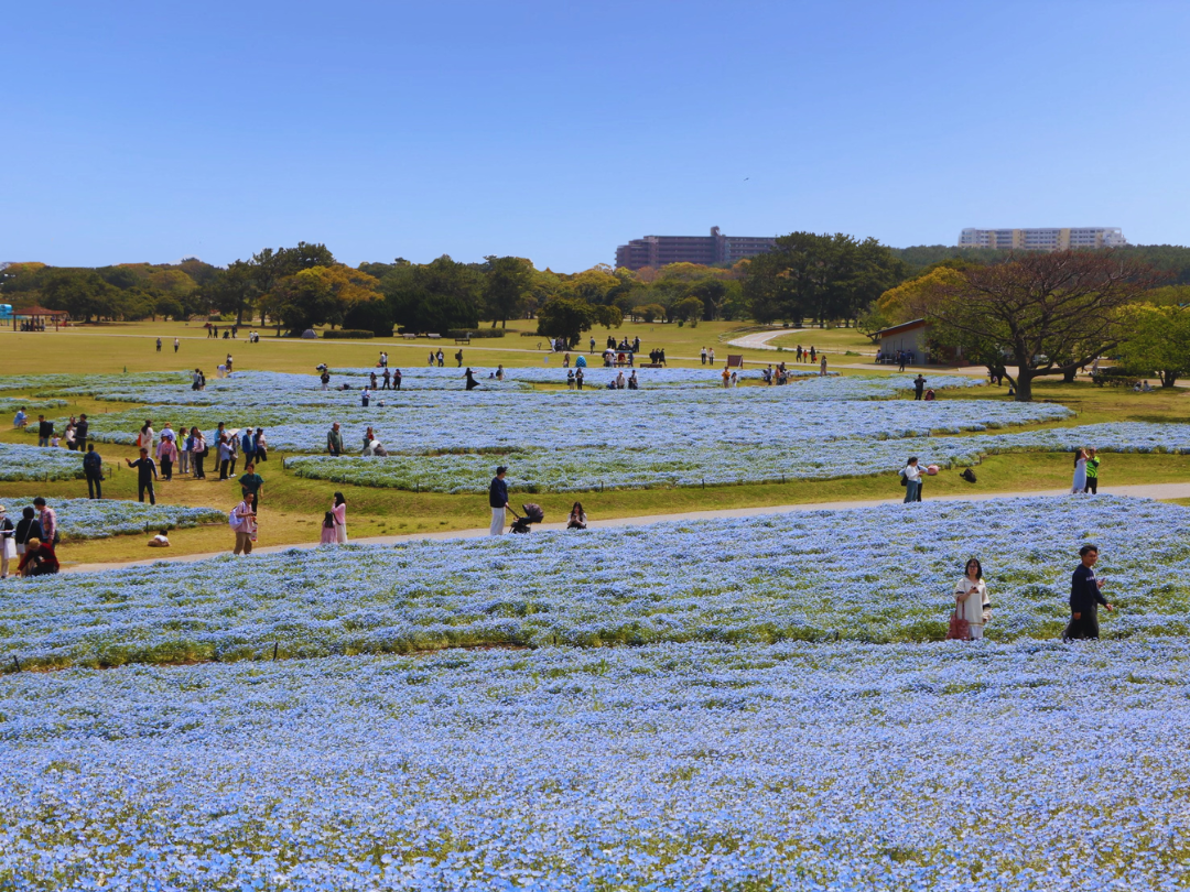 現在、花の祭典「海の中道フラワーピクニック2025」を開催中の「海の中道海浜公園」。100万本規模のネモフィラを園内の「花の丘」で見ることができる。