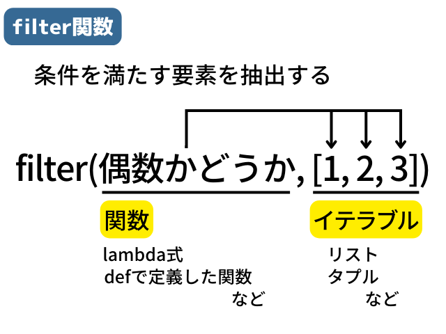 イテラブル(リストやタプルなど)から条件を満たす要素を抽出できます。