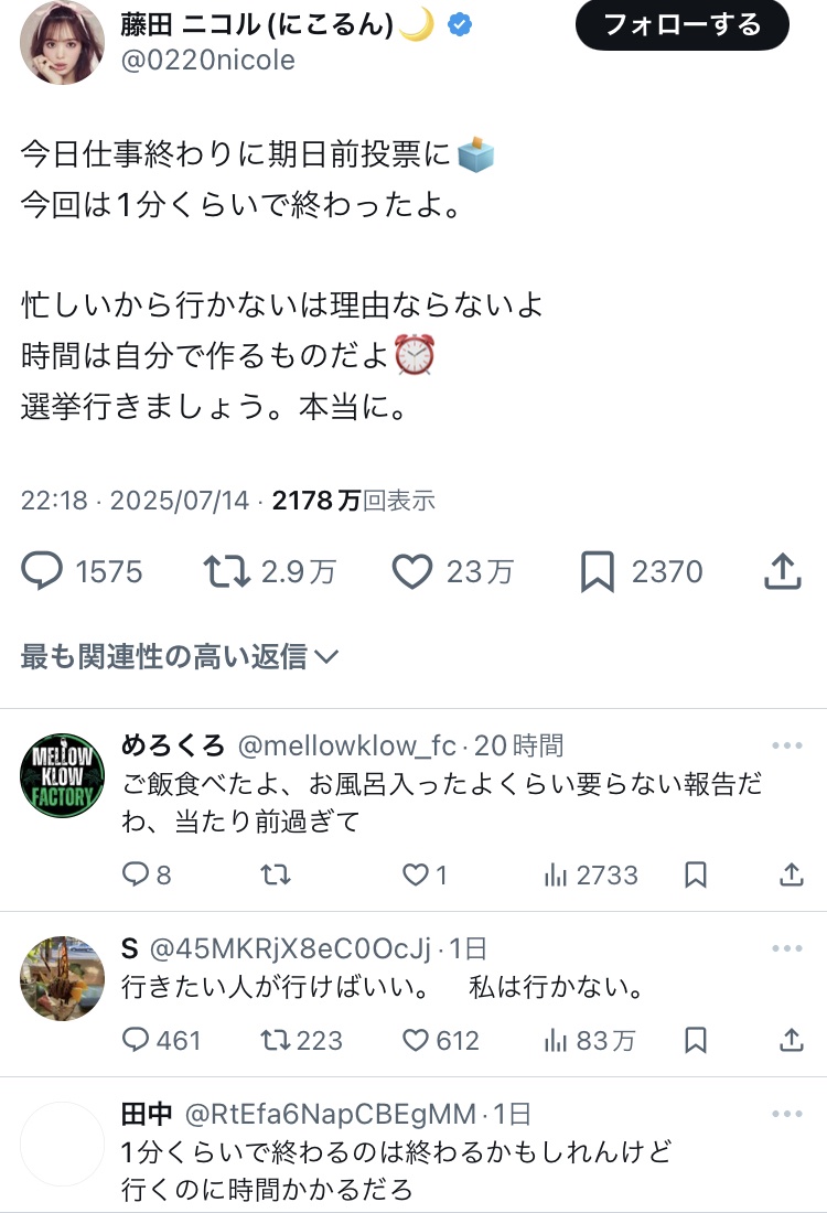 藤田ニコルの「選挙行きましょう」という呼びかけが炎上したのは驚きです。投票に行くこと自体は重要なメッセージであり、批判される理由が理解できません。もしかしたら、政治への関心が高まることを嫌がる勢力がいるのかもしれませんね。