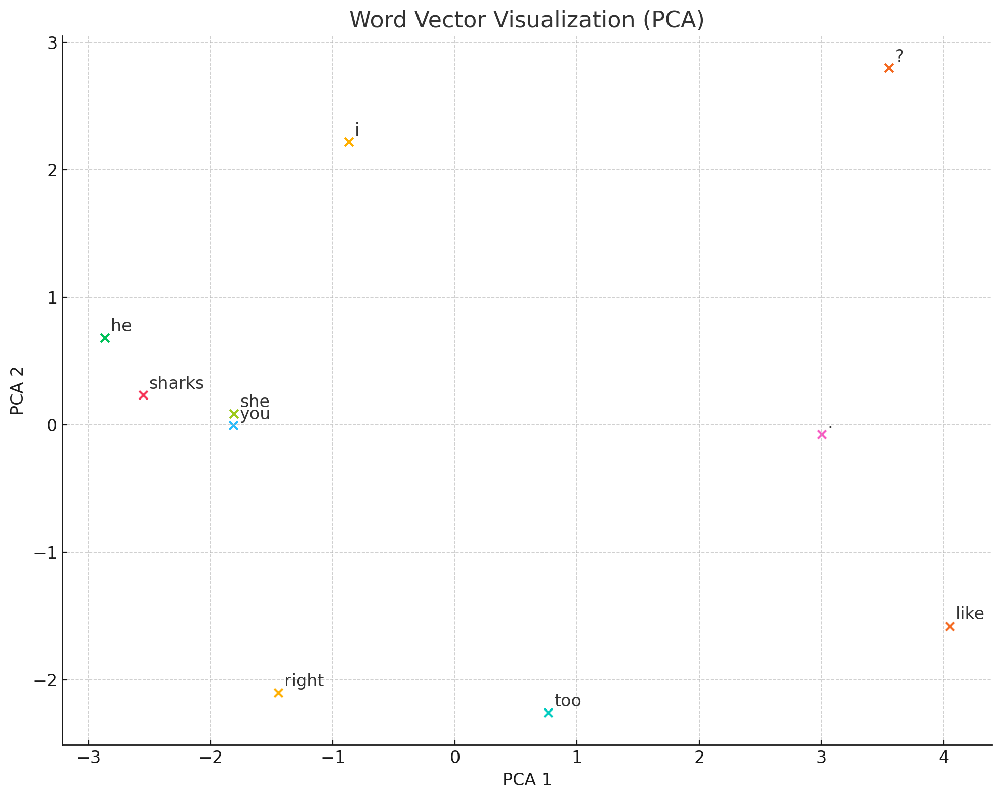 このように、分散表現では、you と shark のような比較的意味が近い(文脈が似る)ことが空間上で表現できるのです。