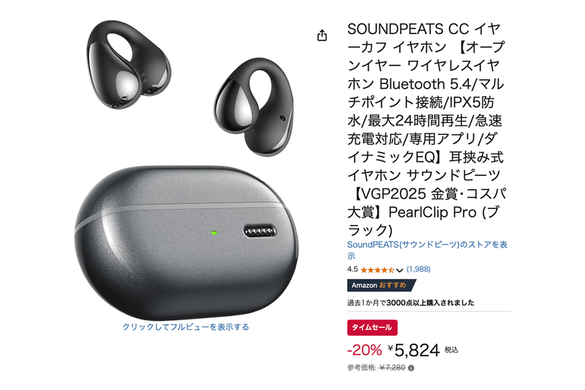 Amazonタイムセールで、VGP 2025にて金賞・コスパ大賞の2つを受賞したSOUNDPEATSのオープンイヤー型完全ワイヤレスイヤホン「PearlClip Pro ブラック」が本日限定100台でラインナップ。通常参考価格より20%オフの5,824円で販売中だ。