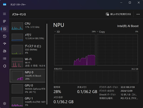 AI特化型プロセッサのNPUも内蔵されているが世代が古く、最大13TOPSとMicrosoft「Copilot+ PC」の要件(40TOPS以上)は満たしていない。それでもNPU対応アプリを生かせるのはうれしいところだ。