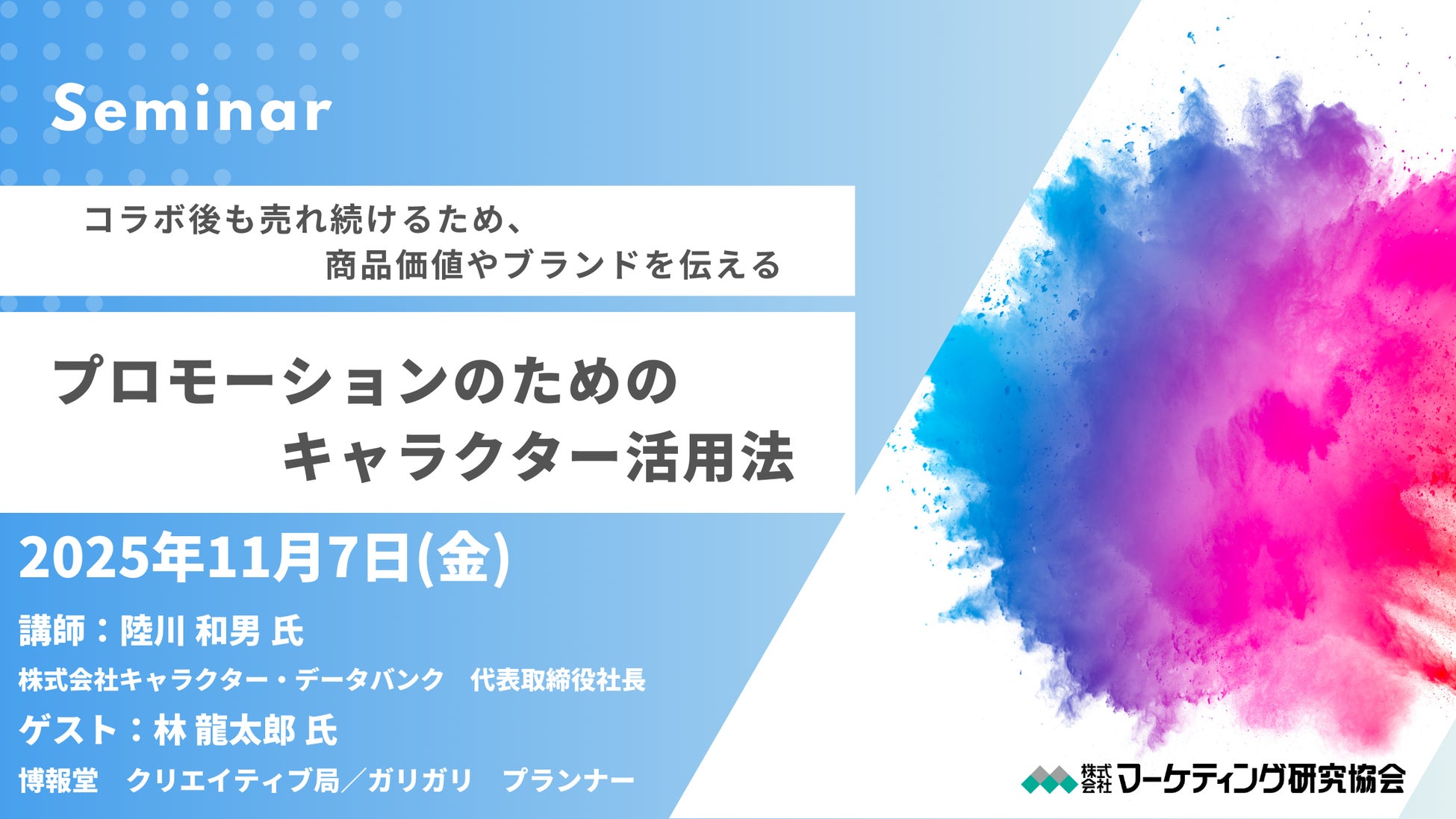 2025年11月7日(金)に、株式会社マーケティング研究協会が主催するオンラインセミナー「キャラクター活用法」が開催される。セミナーでは、キャラクターを用いたマーケティング戦略やIPコラボの実務に関するノウハウが共有され、特にアニメやキャラクターが直面するリスクや成功事例を紹介する。講師は株式会社キャラクター・データバンクの代表取締役社長、陸川和男氏で、ゲストには博報堂のプランナー、林龍太郎氏が参加する。受講料は33,000円(税込)で、アーカイブ配信も行われる。