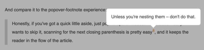 ジェイク・アーチボルドはこう書いています。 使用しない ウェブ上の脚注。 脚注を使用しないのですか?!私は良い脚注が大好きです。少なくとも、私はそう思っていました。ここには、追加のコンテキストを提供する情報を貼り付けることができますが、本文に押し込むと気が散ってしまいます。他の方法では成立しないかもしれないジョークをどのように挿入するかなど、トーンを変えることもできます。