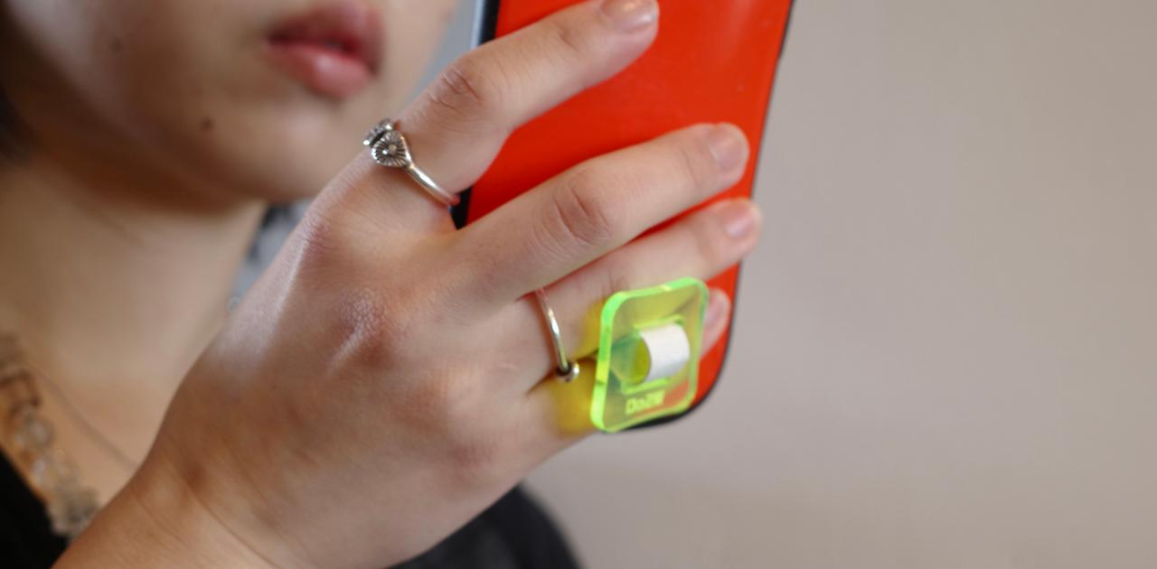 そして、スマホを持つときは、先端のボタン部分(蛍光イエローの部品)から出ている白いテープを小指と薬指で挟み込みます。このときスマホは手で握らず、リングに乗せるようなイメージです。