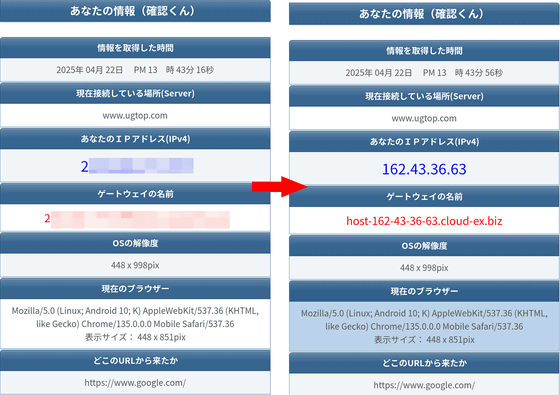 現在使用しているIPアドレスなどの情報を取得できる確認くんを開いて、VPN接続の効果をチェックしてみました。すると、VPN未使用時(画像左)とSafeSurf VPNでVPNをONにして接続した時(画像右)で、IPアドレスおよびゲートウェイの名前が変わっていることがわかります。