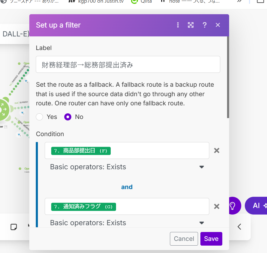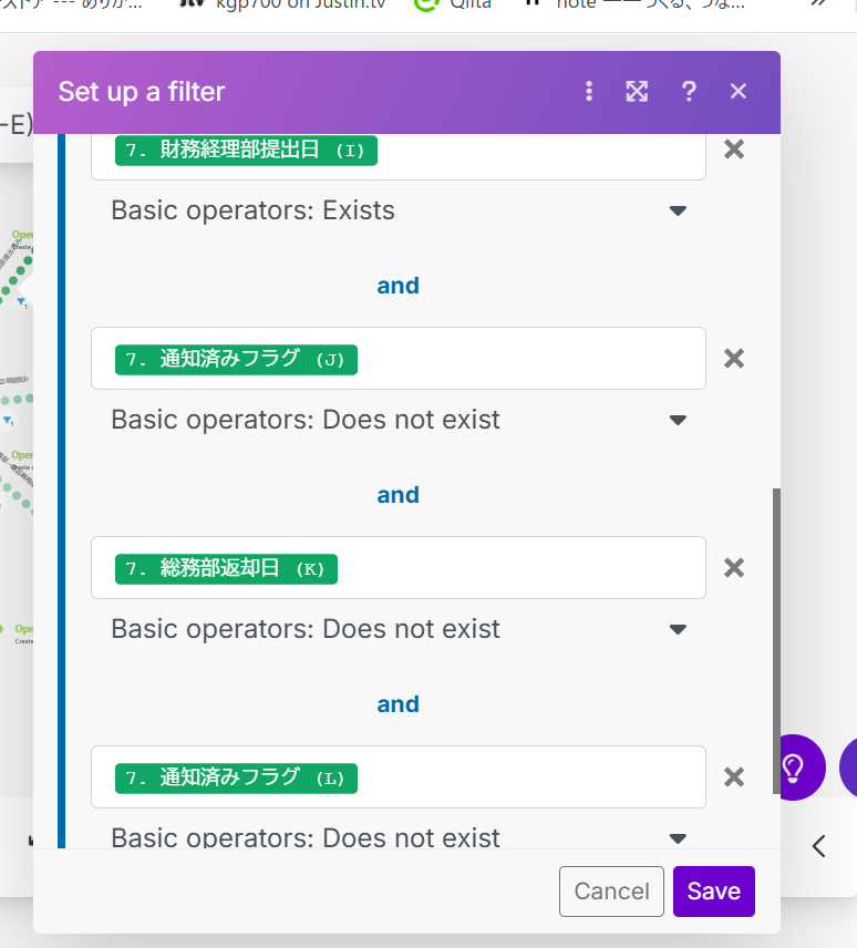 この場合は財務経理部→総務部へ流したいので、日付が入力されているのか、また通知済みフラグ欄に「済」と入力されているかの条件を入れてます。