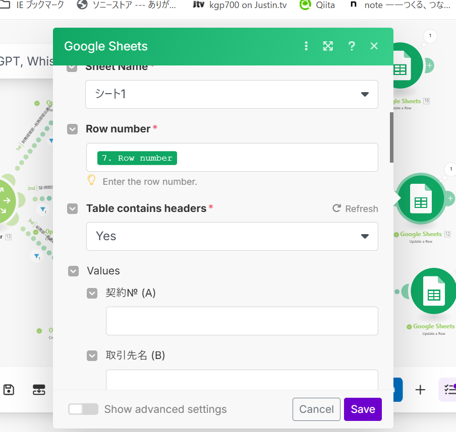 Google Sheetsモジュール・Update a Row を作成・つなげます。