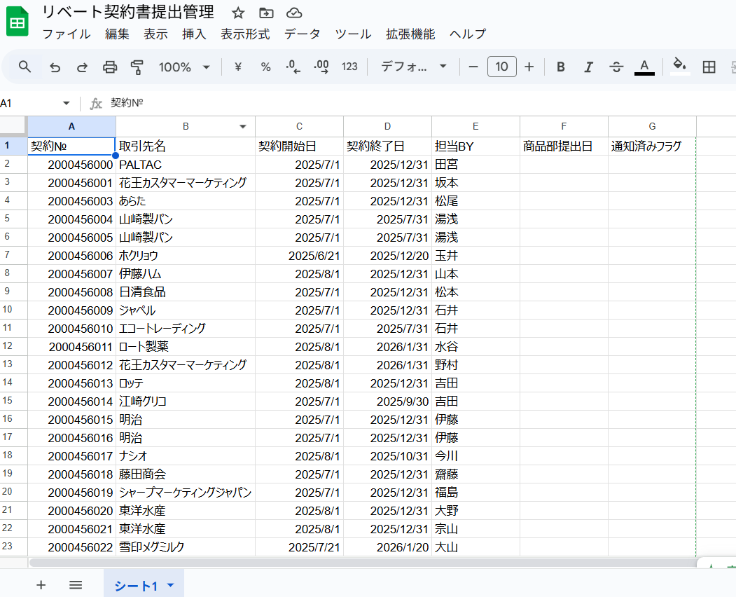 契約番号・取引先名・契約期間(開始日・終了日)担当BY(名前はよく見ると(;^_^A)