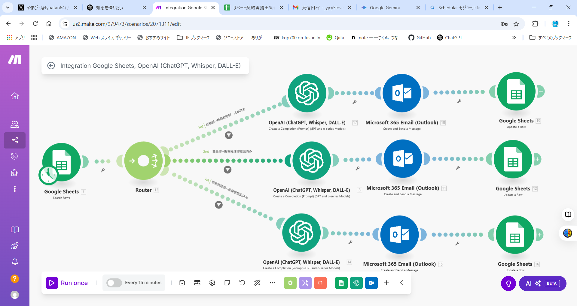 Google Sheetsモジュールから、Routerを使い3つ分岐させています。