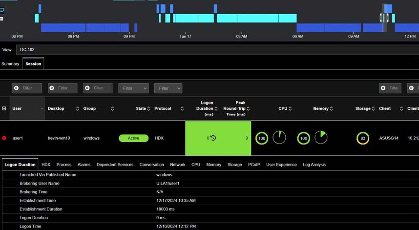 加えて、エンドユーザーのCitrixセッション情報(接続状態、遅延、リソース使用状況など)を可視化でき、ユーザー体験の最適化にも貢献する。2021年に追加したHorizon VDI解析機能に加え、Citrix VDI解析機能も搭載したことにより、幅広いVDI監視の需要に対応する。利用にはCitrix VDIモニタリングオプションライセンスが必要。