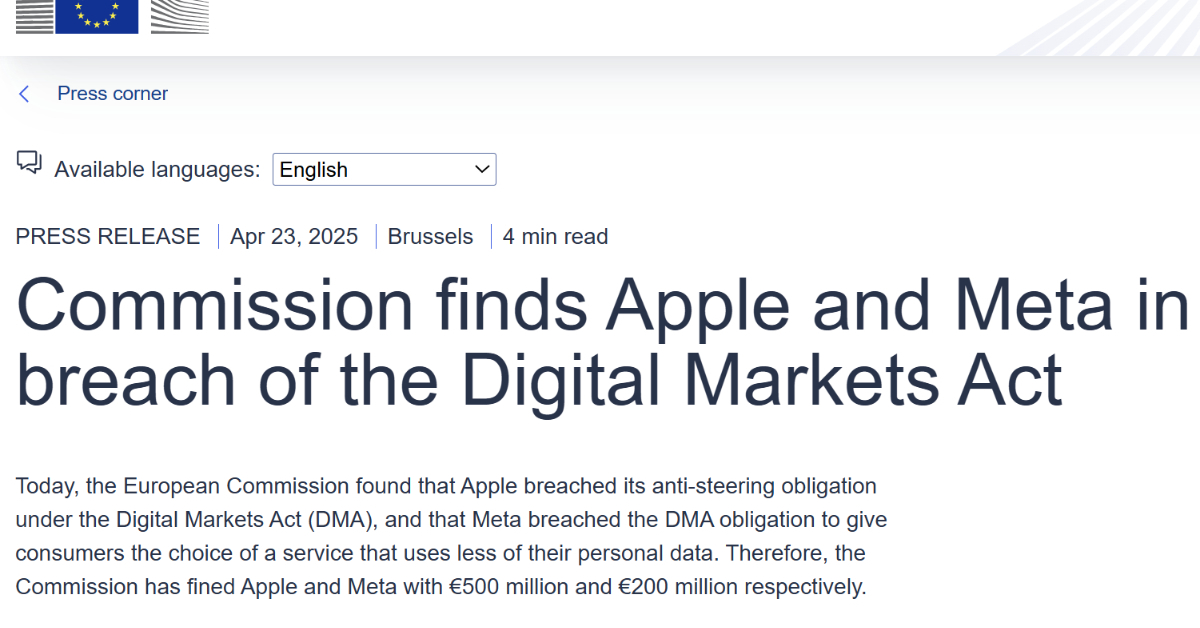 欧州委員会は、AppleとMetaがデジタル市場法(DMA)に違反したとして、それぞれに制裁金を科したと発表した。DMA違反に対する制裁金が科されるのはこれが初。両社は異議を申し立てる見込みだ。