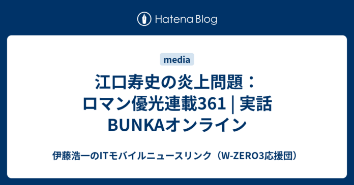- Advertisment - ホームニュースエンタメニュース江口寿史の炎上問題:ロマン優光連載361 | 実話BUNKAオンライン エンタメニュース 江口寿史の炎上問題:ロマン優光連載361 | 実話BUNKAオンライン By itokoichi 2025年10月11日 0 3 シェア FacebookTwitterPinterestWhatsAppCopy URL https://bunkaonline.jp/archives/7771#google_vignette 続きをみる 🧠 編集部の感想: 江口寿史の炎上問題は、表現の自由と社会的責任の境界を考えさせる重要な議題です。特に、コメントや批判が炎上を招く現代のSNS文化が影響していると感じます。彼の作品が持つ独自の視点やメッセージについて再評価する機会になるかもしれません。 Views: 2共有: Facebook で共有するにはクリックしてください (新しいウィンドウで開きます) Facebook クリックして X で共有 (新しいウィンドウで開きます) X クリックして LinkedIn で共有 (新しいウィンドウで開きます) LinkedIn クリックして Tumblr で共有 (新しいウィンドウで開きます) Tumblr クリックして Pinterest で共有 (新しいウィンドウで開きます) Pinterest クリックして Threads で共有 (新しいウィンドウで開きます) Threads クリックして Bluesky で共有 (新しいウィンドウで開きます) Bluesky いいね:いいね 読み込み中… 関連 Tags実話BUNKAオンライン江口寿史の炎上問題ロマン優光連載361炎上 シェア FacebookTwitterPinterestWhatsAppCopy URL 前の記事Xiaomi Pad 7 Pro、これ買うべき?次の記事「-10℃でも安心!新素材アウター登場」 RELATED ARTICLES エンタメニュース 伊藤かりん、甥っ子2号誕生を報告!抱っこショット公開✨ 2025年10月11日 エンタメニュース 【マスゴミ】時事通信「支持率が下がるような写真しか出さねえぞ」実例が発掘されて絶賛炎上中wwwww 2025年10月11日 エンタメニュース 乃木坂46岩本&冨里、等身大W主演ドラマ! 2025年10月11日 返事を書く 返事をキャンセル コメント: あなたのコメントを入力してください。 名前:* ここにあなたの名前を入力してください Eメール:* 間違ったメールアドレスを入力しました。 ここにあなたのEメールアドレスを入力してください ウェブサイト: 次回の私のコメントのためにこのブラウザに私の名前、電子メール、そしてウェブサイトを保存してください。 Δ - Advertisment -