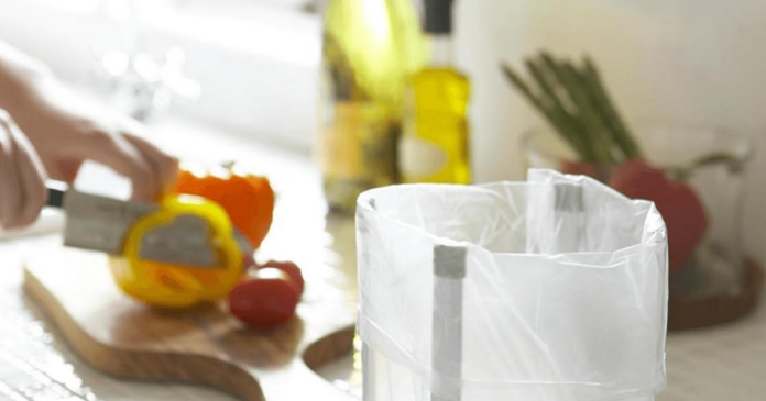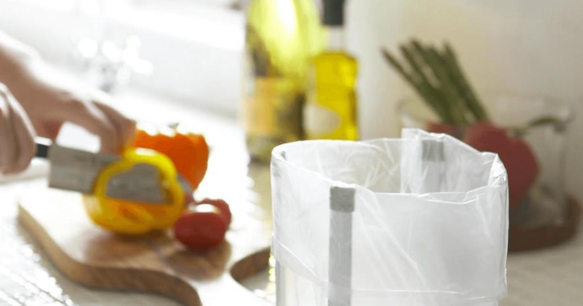 キッチンでゴミ出しや水切りを助けるこのホルダーは、収納後は引き出しに収まるため、見た目もすっきり。