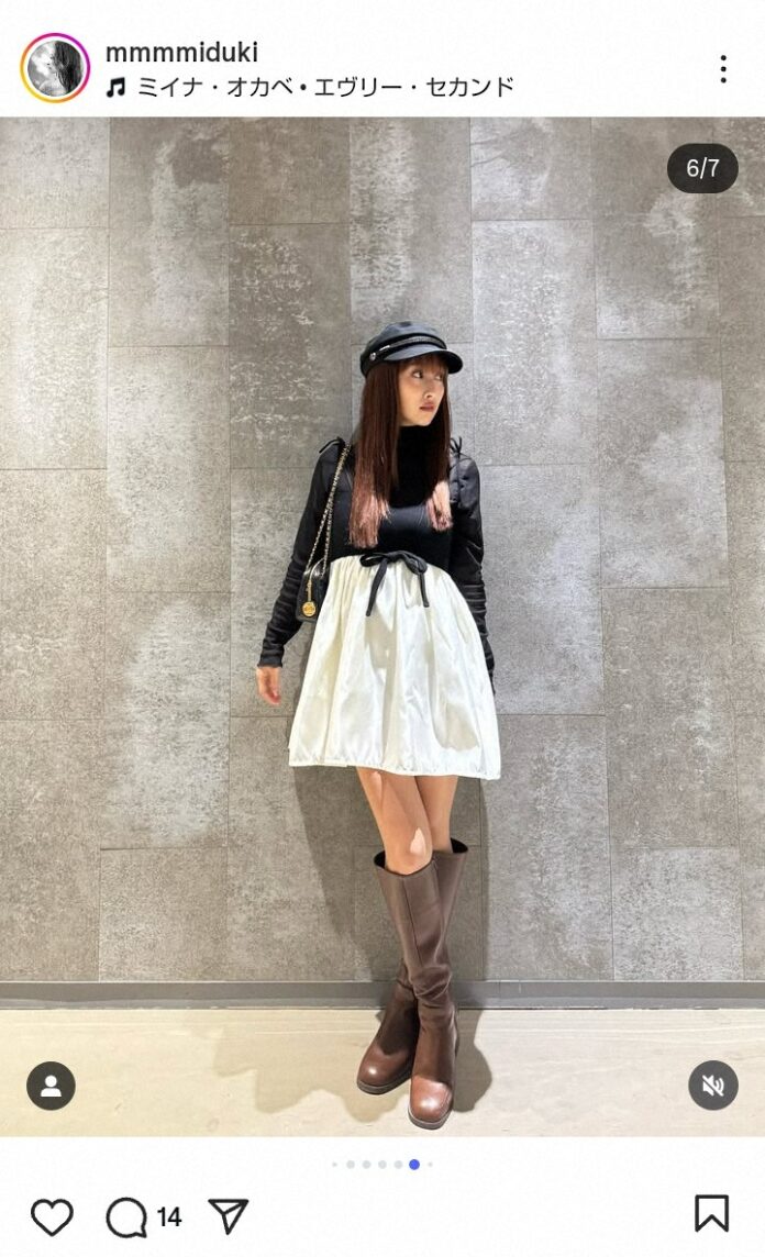 ミヅキさんは「秋ーー」と始める投稿で、キャメル色のニットポロセーターに青いデニム、そしてバッグを持ったスタイリッシュな姿を紹介。また、黒いキャスケットに黒と白のミニワンピース、茶色のブーツを合わせたコーディネートも披露しました。さらに、赤い長髪を重めの前髪でスタイリングしたショットも投稿し、ファッションセンスの良さをアピールしています。