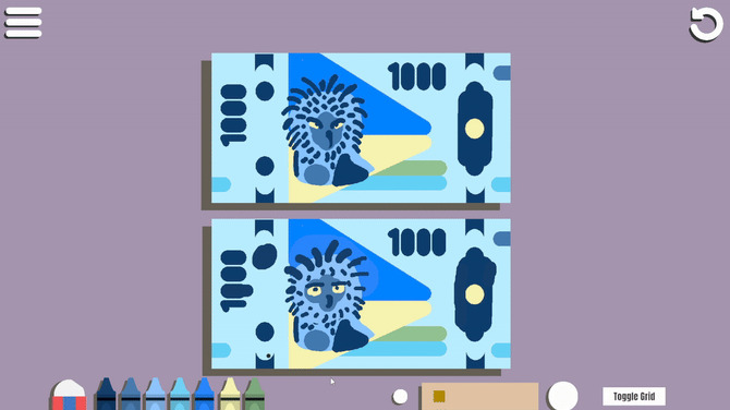 出来上がった贋作は本物と重ね合わせてどれだけ一致しているかを計測する様子。紙幣風イラストやムンクの「叫び」のような名画風イラストなどを確認できます。また、100%一致する贋作を目指す「チャレンジモード」や、作った美術品を査定してもらえる「サンドボックスモード」も搭載されています。