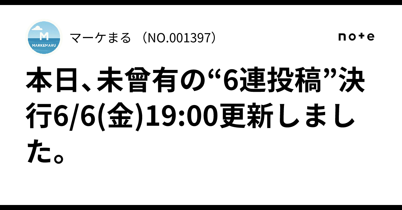 🔥本日、未曾有の“6連投”決行‼️6/6(金)19:00更新しました。こんばんわ、マーケまるです🎈昨日の講座で火がついた──今日は、その“火種”を反響の炎に育てます🔥テーマはズバリ、「共鳴から反響へ」──信頼は熱で生まれる。大学で得た学びを、即・実践。今日も1日、熱く仕掛けていきます💥以下が本日の発信スケジュールです🗓️①-1✅ 6:00🗞️マーケまる新聞【第9号朝刊】『共鳴から反響へ、未曾有の着火点🔥』┗ 昨日の講座の余韻と今朝の共鳴をつなぐ構成。「反響とは、“人の熱”である」と伝えます。②-1記事は、こちらhttps://.com/markemaru_460/n/n5c32744959e2①-2 ✅ 12:00🧪未曾有の実験レポ『大学の掲示板が、僕の運命を変えた件』┗ SNS(X)ではなく“”を選んだ理由、掲示板との出会い、実際の効果など赤裸々に綴ります。②-2記事は、こちらhttps://.com/markemaru_460/n/n009b75330c24①-3 ✅ 15:00📝共鳴マーケ講座 番外編『発信が刺さる“余白”の法則』┗ 情報を詰めすぎず、読み手の想像に託す投稿設計について考察。②-3記事はこちらhttps://.com/markemaru_460/n/n3e05942f5917①-4🗞️マーケまる新聞【特別重版】──マーケまる語録:ポンコツの哲学 編🔥②-4記事はこちらhttps://.com/markemaru_460/n/n9ea9114501c①-5 🗞️マーケまる新聞【深夜のぼやき速報便】──ポンコツ組織の“第4の壁”とは?誰かが言わなきゃ、壊れない壁がある。🧱②-5 記事はこちらhttps://.com/markemaru_460/n/n09ae54dd19e1①-6 ✅ 20:00🔥夜のスパーク投稿(信念系)『信頼は、炎よりも熱い。』┗ 共鳴→反響→信頼へ。マーケまるの“発信軸”を宣言します。②-6記事はこちら