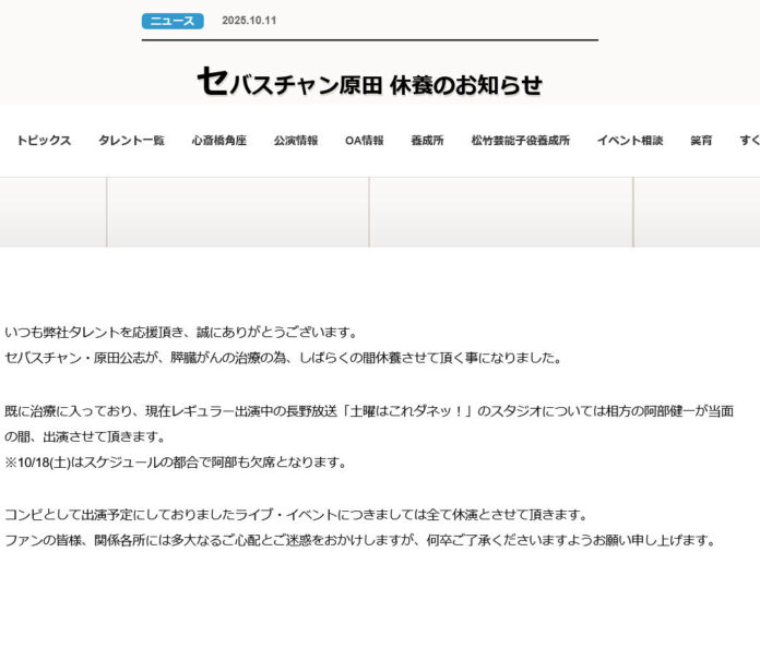 松竹芸能に所属するお笑いコンビ「セバスチャン」の原田公志(39歳)が、すい臓がんの治療のため、しばらく休養することを公式サイトで発表しました。このニュースは、ファンや関係者に大きな衝撃を与えています。