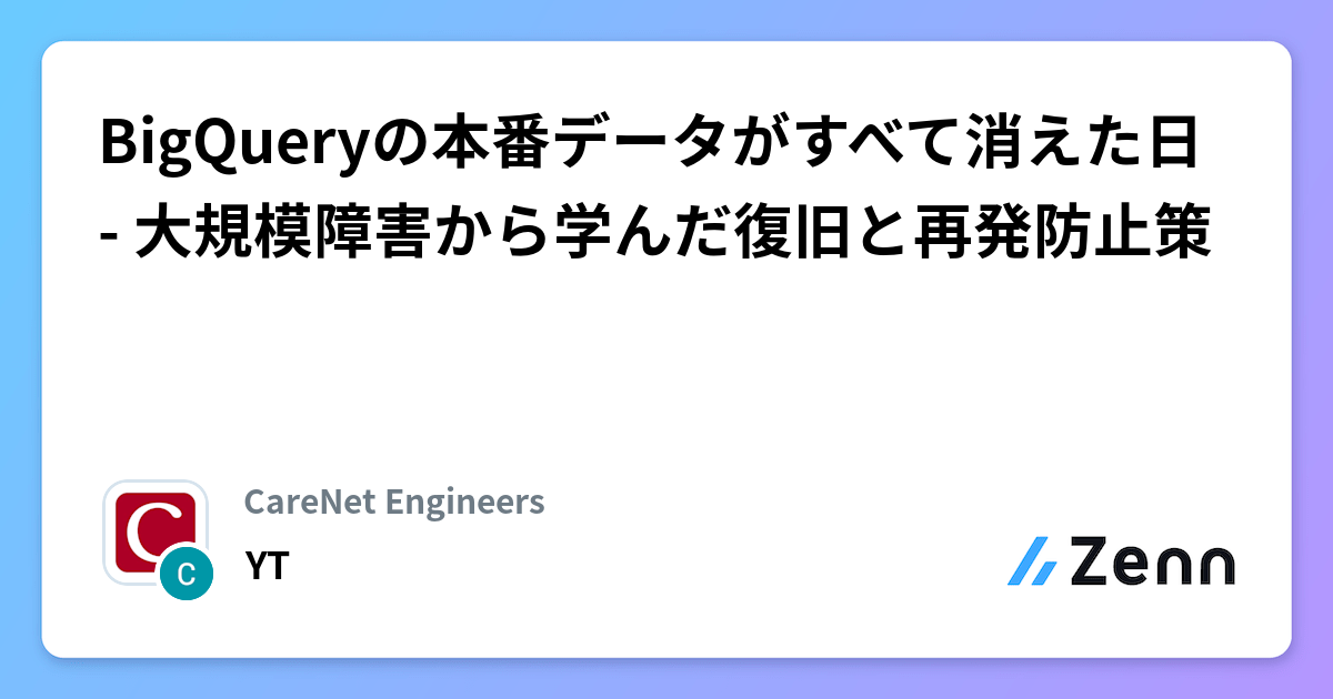 今回は、冷や汗が止まらなかった、BigQueryの本番データセットをすべて削除してしまったインシデントについて、その原因と復旧の過程、そして得られた学びを共有したいと思います。同じような環境でデータ運用されている方の参考になれば幸いです。