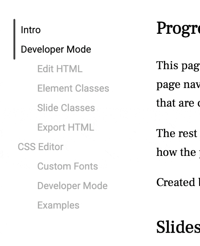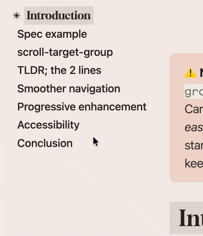 私の大好きな男の一人、ハキム・エル・ハッタブが「Progress Nav」というものを作ったのを覚えています。 10年前。 このアイデアは、ページ内のどこにスクロールしているかを通知し、それを目次のデザインに反映できる目次コンポーネントです。