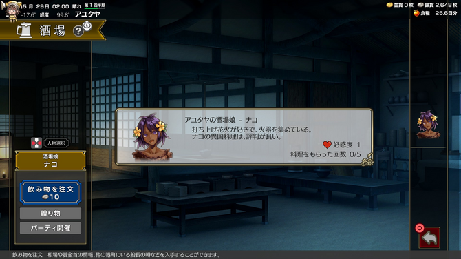 好感度が一定以上になれば、酒場娘から料理がもらえます。料理はこのゲームにおいて装備品のようなもの。航海士に装着することで、ステータスやスキルを上げることができます。また、余った料理は酒場でパーティーを開くことも。料理はサルベージや海戦でも入手可能です。
