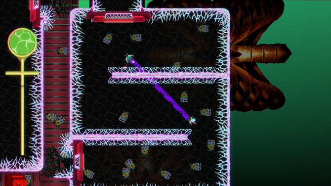 『SONOKUNI』は、個性的な2Dピクセルと手書き風のイラストで構成されています。見ての通り、目がチカチカするような原色を基調とするカラーリングが、“色彩の暴力”といっても過言じゃないくらい非常に強烈な印象です。その毒々しいアートスタイルは、本作の独自性を際立たせている一方で、日本神話とSFが融合したダークな世界観にぴったりの素晴らしい仕上がりだと感じました。