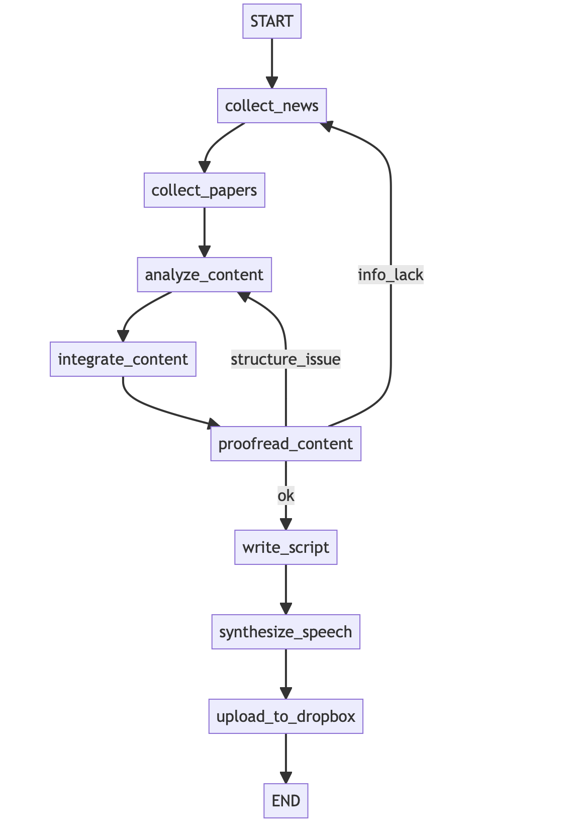 上記の前回記事で詳細は記載していますが、ニュース記事の収集・要約・原稿生成からテキスト音声変換まで、一連の工程をLangGraph上に構築しました。