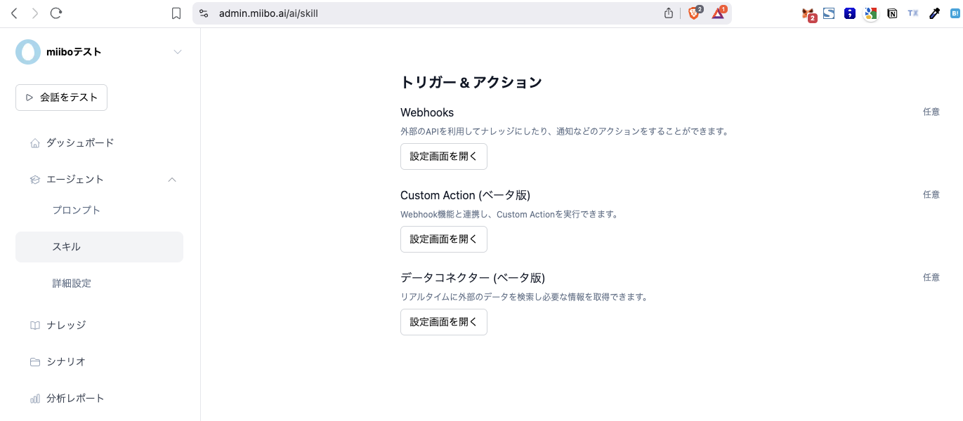 miiboの会話型AIでWebhookの設定から任意のタイミングでカスタムアクションを呼び出す連携処理を行います。