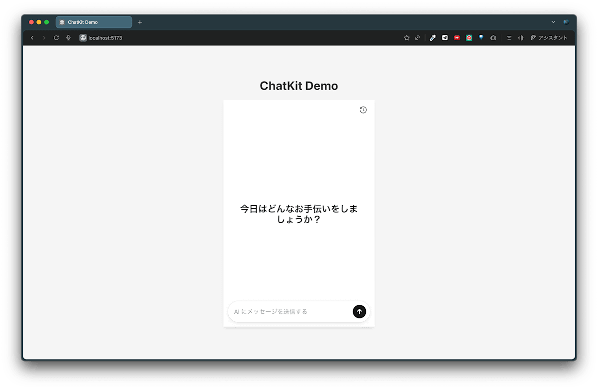 にアクセスすると、ChatKitのチャットUIが表示され、Agent Builderで作成したAIエージェント(ワークフフロー)と会話できます。