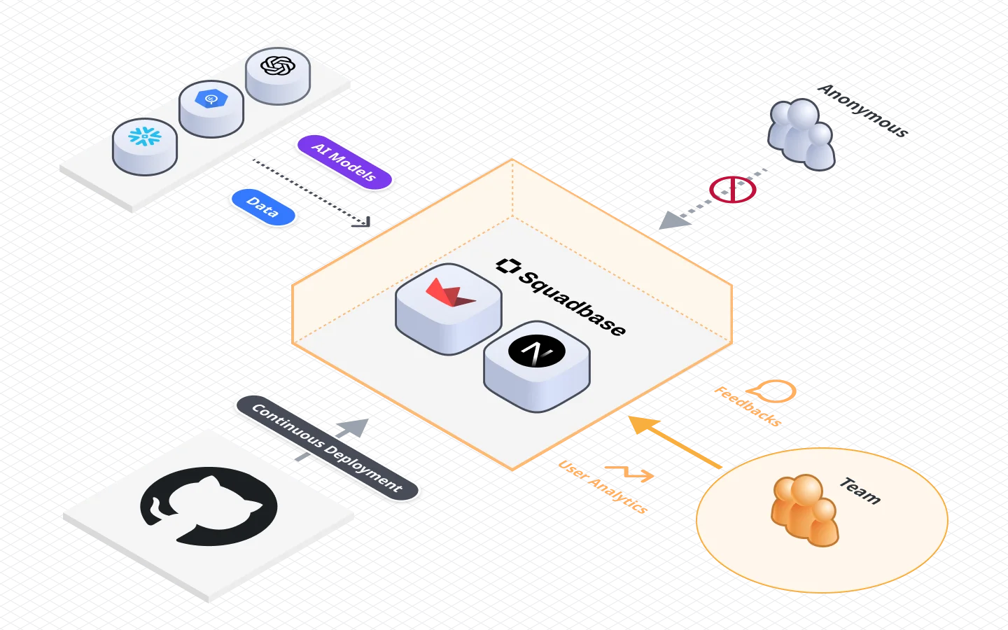 Squadbaseは、AIアプリの社内運用に特化したクラウドPaaS。StreamlitやNext.jsなど、主要AIアプリ/WebフレームワークをGitプッシュだけで本番運用できる。