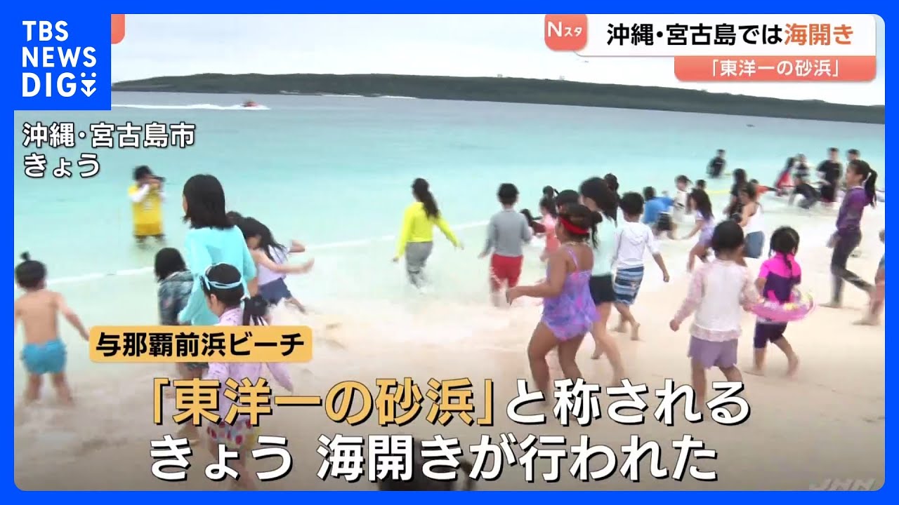沖縄県宮古島市では「東洋一の砂浜」と称される与那覇前浜ビーチで海開きが行われ、子どもたちが初泳ぎを楽しみました。