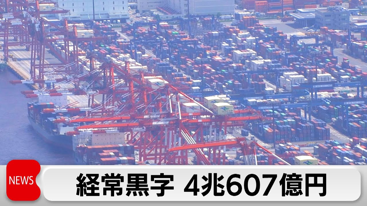 財務省が発表した2月の国際収支によりますと、経常収支は4兆607億円の黒字となりました。黒字は2カ月ぶりです。海外とのモノやサービスなどの取引で日本の稼ぎを示す2月の経常収支は4兆607億円の黒字でした。黒字は2カ月ぶりで、黒字額は1年前と比べて48.4%増えました。輸出から輸入を差し引いた貿易収支は7129億円と黒字に転換しました。輸出は10.4%増え9兆55億円と、2カ月連続のプラスでした。一方、輸入は1.9%減少し8兆2926億円で、3カ月ぶりのマイナスとなりました。