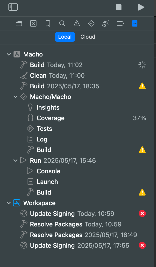 1. Xcode の左の Navigator の上部タブの中から、ログのタブを選択する